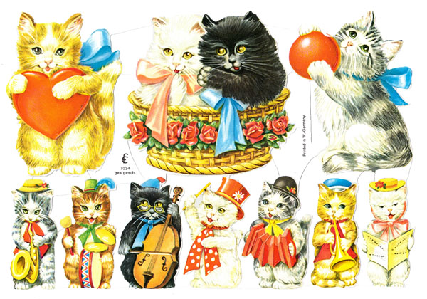 Ein komplettes Katzenorchester ist hier auf diesem Glanzbilder Bogen vereint. Glanzbilder „Katzenorchester“ sind hervoragend für die Gestaltung von Grusskarten oder zum Dekorieren geeignet. Die Poesiebilder lassen sich prima zum Ausschmücken in Poesiealben und zum Verzieren von Bastelideen verwenden. Es gibt auch die Variante „Glanzbilder“ mit Silberglimmer (Glitzer)