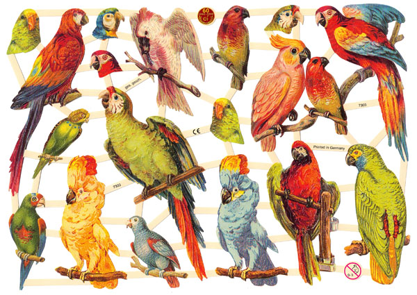 Glanzbilder "Papageien" Motive ideal zum Basteln, Verzieren von Poesiealben, Grußkarten oder zum Dekorieren. Farbenfroh und fast wie lebendig präsentieren sich diese Papageien.