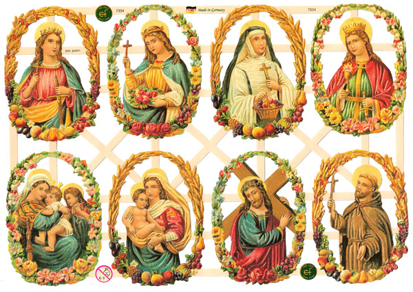 Ein Glanzbilderbogen mit wunderschönen Heiligendarstellungen zum Sammeln, Basteln und Dekorieren. Mit den Poesiealbum-Bilder entstehen tolle Dekorationen, Verzierungen und vieles mehr. Die Glanzbilder sind beliebte Sammel- und Tauschobjekte. In einer Variante sind die Glanzbilder mit silberfarbenen Glitter (Glitzer) versehen.