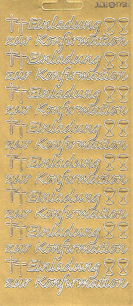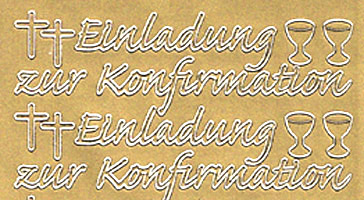 Dekorativer Kontursticker Bogen mit Schriftzüge "Einladung zur Konfirmation" mit Kreuz und Kelche für die Grußkartengestaltung, Scrapbooking und andere kreative Bastelideen. Die Sticker Motive lassen sich einzeln vom Bogen entnehmen, können anschließend auf nahezu alle glatten Oberflächen platzieren werden, festdrücken, fertig.