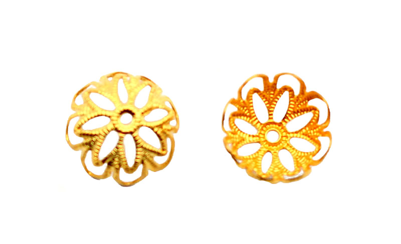 Filigrane Perlenkappen „Blume“ in dünner, relativ flacher Form. Perlenkappen werden einfach auf die Perlenpole aufgesetzt und mit auf das Fädelmaterial aufgezogen. Perlenkappen verändern den Stil jeder Perle und lassen sich einfach und flexibel, ohne großen Aufwand verarbeiten. Die Metall Perlenkappen lassen sich als Zubehör in Klosterarbeiten und Schmuck einarbeiten. Die Perlkappen Halblinsen sind als Verzierung zum Aufnähen oder Aufkleben für viele Bastelidee geeignet.