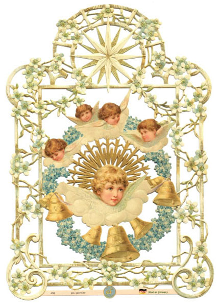 Exklusives Schmuckrelief / Fensterbild „Engel in Glockenkranz“ 1 grosses Motiv, filigran und aufwendig produziert und mit einem Band zum Aufhängen. Das Glanzbild ist doppelseitig bedruckt, somit ist das Motiv von jeder Seite sichtbar und ist eine schöne Weihnachtsdekoration im Fenster.