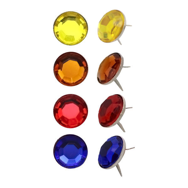 Strass Splintnieten bestehend aus einem eingepassten Stassstein und einer Splintfassung. Strass Splintnieten eignen sich gut zum Verzieren von Kleidung oder Accessoires, Lederjacken, Taschen, Schuhen und Hundehalsbändern. Das Befestigen der Ziernieten gestaltet sich hierbei sehr leicht, die Zacken der Splintnieten durch das jeweilige Material drücken (eventuell vorstechen) . Anschließend müssen die Splinte auf der Rückseite nur noch umgebogen werden. Es ist kein spezielles Werkzeug nötig. Diese Fassung kann auch verlötet werden.