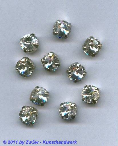 Swarovski® Strassstein Rund mit spitzer, foiled Unterseite ist in einer platinfarbener Kesselfassung mit seitlich 4 Bohrungen zum Durchfädeln von Schmuckdraht. Damit lassen sich tolle Modeschmuckteile herstellen. Diese Strass-Steine eignen sich zum Aufnähen auf Textilien und vielem mehr.